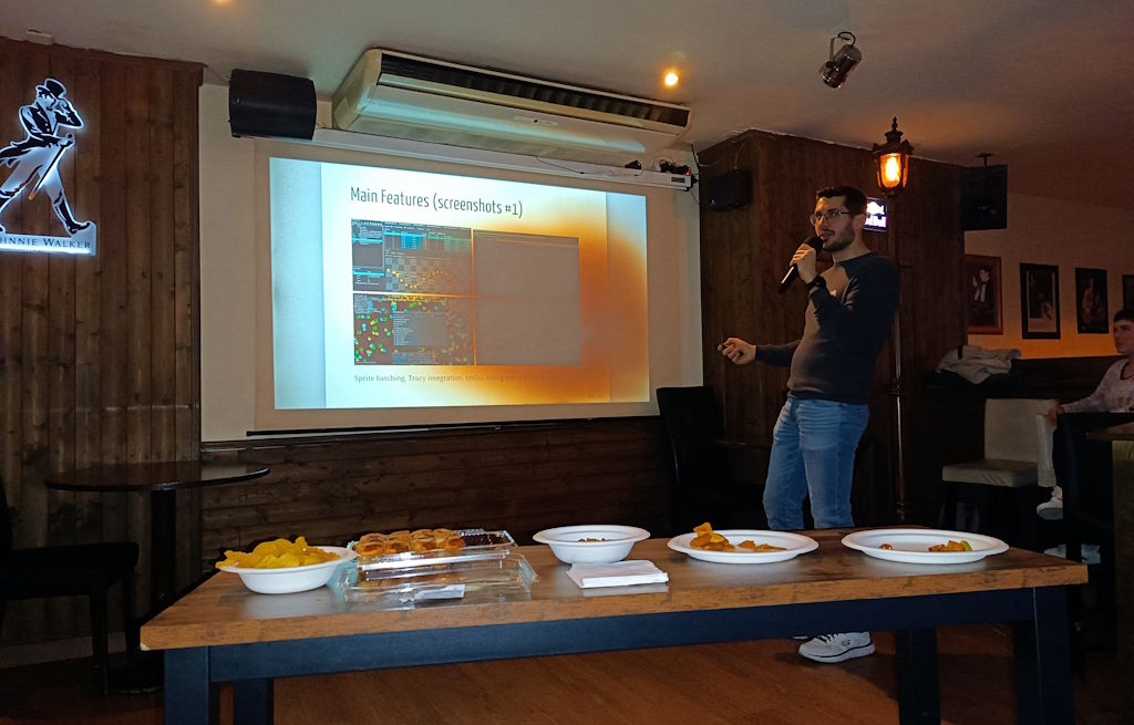 Después de esta introducción llega el momento central del meetup que es la presentación sobre motores personalizados para videojuegos a cargo de Angelo Theodorou que en la página del metup describen como un profesional que actualmente se encuentra desarrollando su propia herramienta. En realidad Angelo es un crack de nivel mundial al que ayer tuvimos la suerte de escuchar y que ahora está asentado en Granada trabajando en sus cosas de programadores y que en sus ratos libres sigue, después de trece años, desarrollando su propio motor para videojuegos en 2D. Trece años para desarrollar un proyecto podrán parecer muchos pero es que crear un motor de videojuegos es una tarea tan desmesurada que requiere tener conocimiento de tantos campos que, salvo que se disponga de un equipo grandísimo, va a llevar necesariamente varios años para llegar a buen puerto.