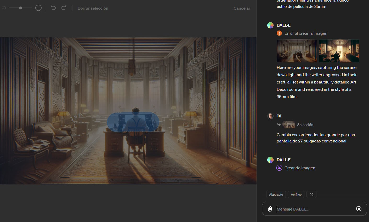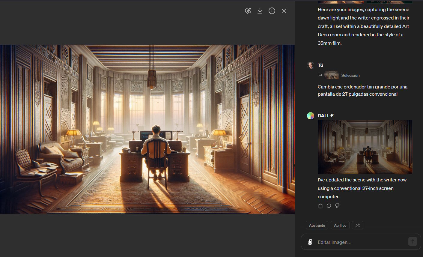 En estas dos capturas te pongo un ejemplo que me ha pasado esta misma mañana. En la primera imagen me lo hizo casi todo bien pero puso al escritor trabajando de un trasto enorme que no se puede identificar como un ordenador. Señalé la zona y le dije que me pusiera al escritor en frente de una pantalla convencional de 27 pulgadas y me sacó la segunda imagen que, aunque no me deja totalmente convencido, ya es una imagen válida para mostrar a un escritor trabajando visto desde atrás.