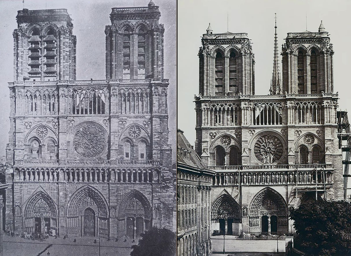 La verdadera resurrección de Notre Dame comenzó en el siglo XIX, liderada por el arquitecto Eugène Viollet-le-Duc. Encargado de su restauración en 1844, Viollet-le-Duc no solo buscó devolver a Notre Dame su gloria medieval sino también completar su visión gótica con elementos que nunca se habían realizado. Su enfoque fue a veces más interpretativo que fidedigno, añadiendo a la catedral elementos como la famosa flecha o aguja, que se convirtió en uno de sus rasgos más icónicos hasta que se destruyó en el incendio de 2019, pero que no formaba parte del diseño original. Hablando en plata, se falsificó todo lo falsificable para justificar una falsa historia gloriosa de Francia por aquello de la grandeur de la France, cosa que los franceses hacen cada vez que pueden sin ruborizarse.