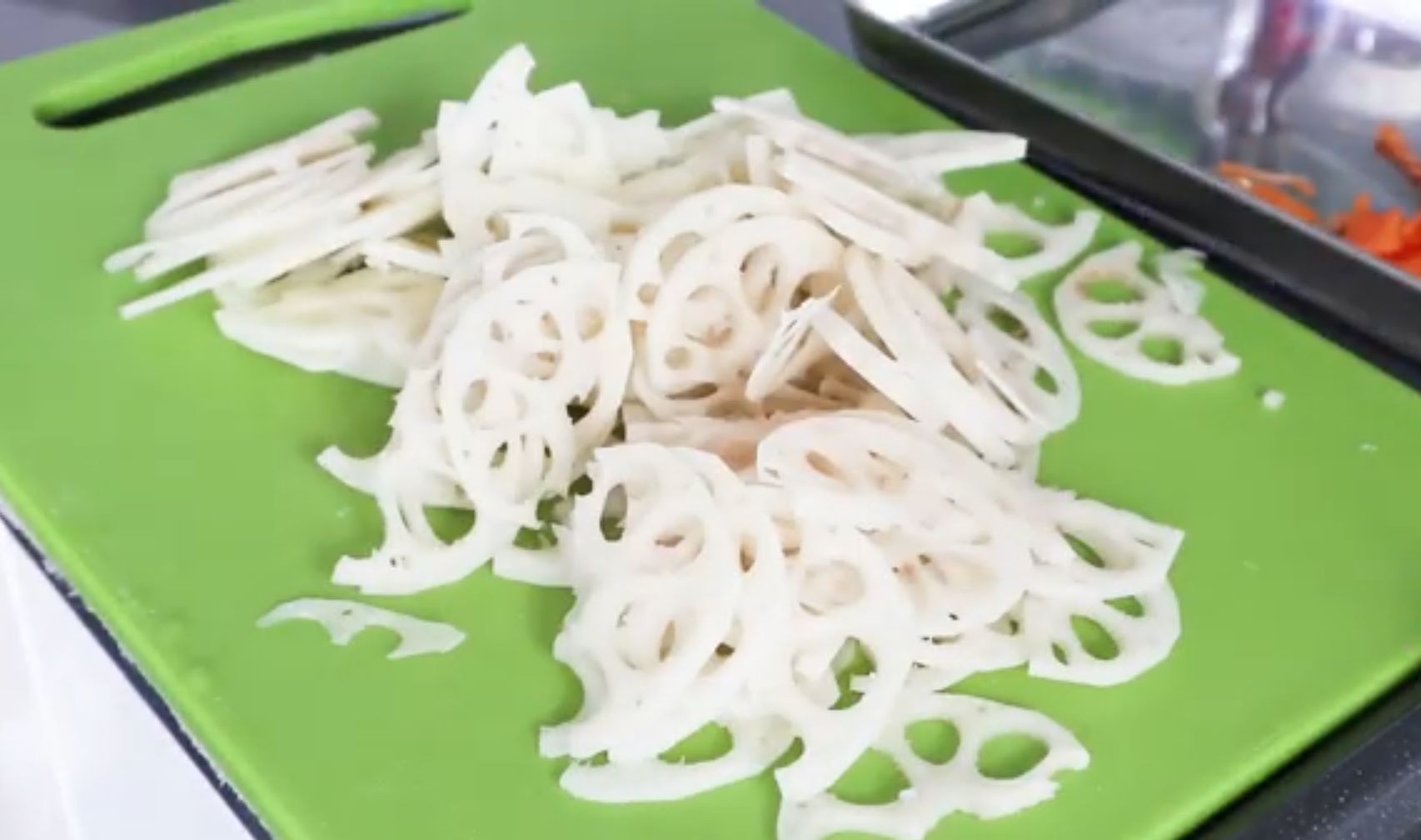 Comenzaremos con la forma más sencilla de disfrutar del renkon: crudo. Cortado en finas rodajas, el renkon crudo puede añadirse a ensaladas, proporcionando un crujiente refrescante y un delicado sabor dulce. Para evitar que las rodajas se oxiden y se vuelvan marrones, sumérgelas en agua fría con unas gotas de vinagre tras cortarlas.
