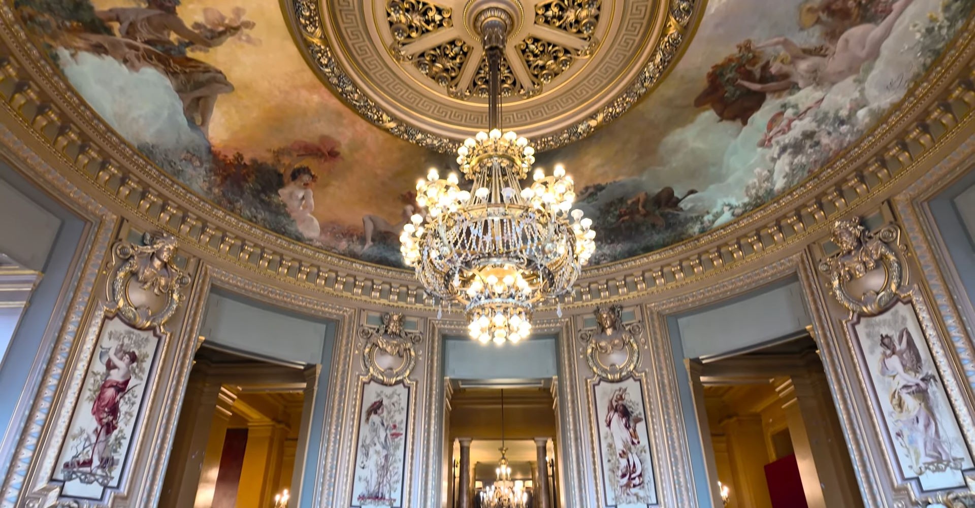 Una de las características más destacadas del auditorio es su techo, pintado por Marc Chagall en 1964, que ofrece un contraste moderno con el estilo clásico del resto del edificio. Esta obra maestra moderna convive armoniosamente con el candelabro de cristal de ocho toneladas que pende majestuosamente del centro del techo, una pieza tan emblemática de la ópera como cualquier ópera representada en su escenario.