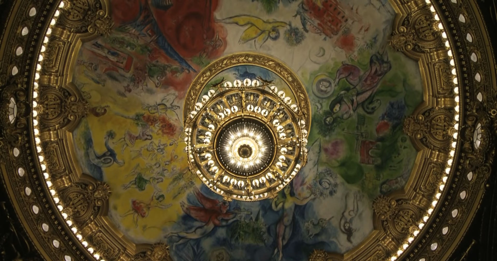 Uno de los aspectos más notables del auditorio de la Ópera Garnier es su techo, obra del artista ruso-francés Marc Chagall, pintado en 1964. Este techo es un contraste moderno que desafía las convenciones del opulento estilo Beaux-Arts del resto del teatro. Chagall fue encargado de reinterpretar el techo original, y lo hizo con una explosión de color y forma que representa escenas de las más famosas obras de la música y la ópera, como «Tristán e Isolda», «Carmen» y «La flauta mágica».